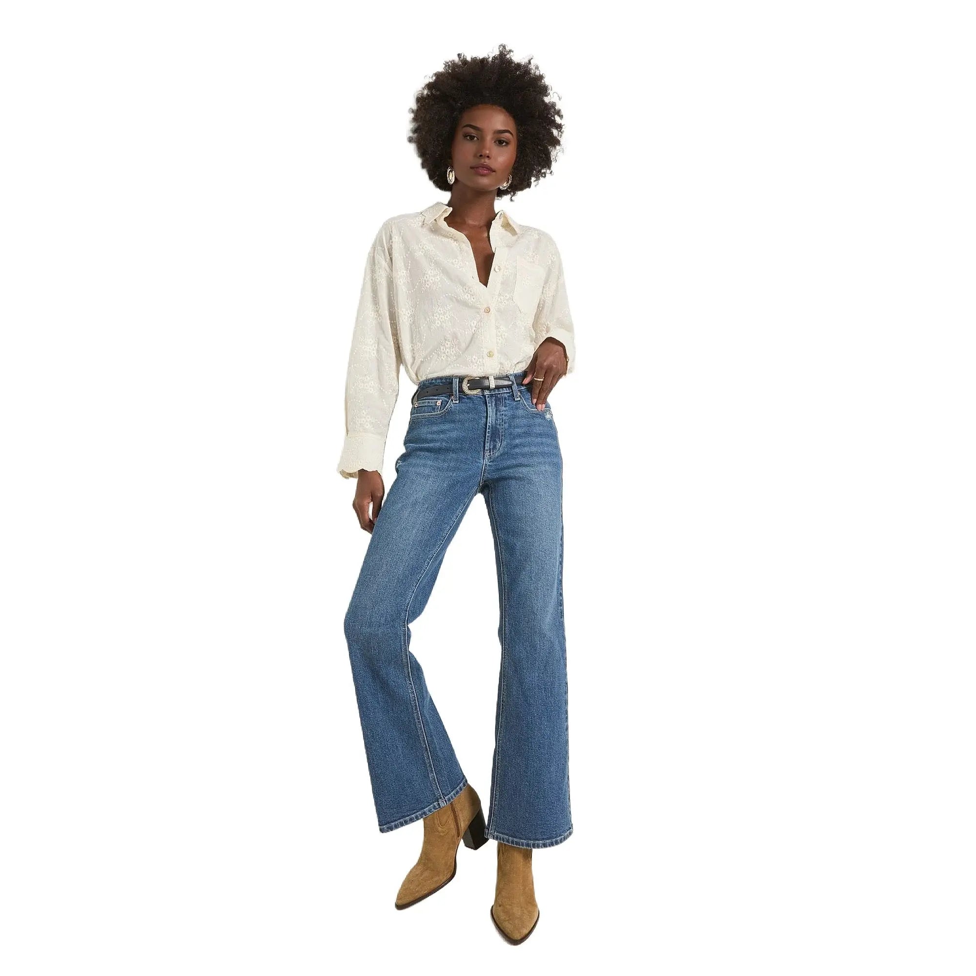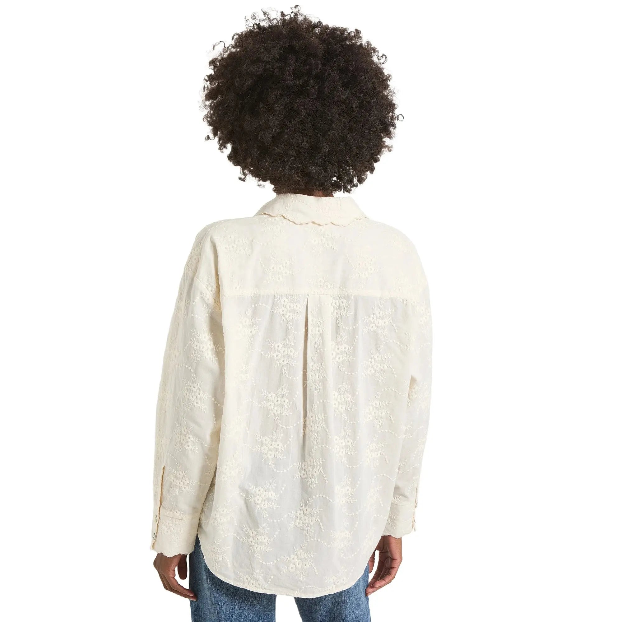 The Radiance Eyelet Shirt is a women's relaxed-fit button-down crafted from lightweight cotton for breathable comfort. Perfect for everyday wear or casual outings, this shirt features charming embroidered details and scalloped edges that add a flirty touch to any outfit. The versatile design makes it ideal for layering or styling with your favorite jeans or skirts.