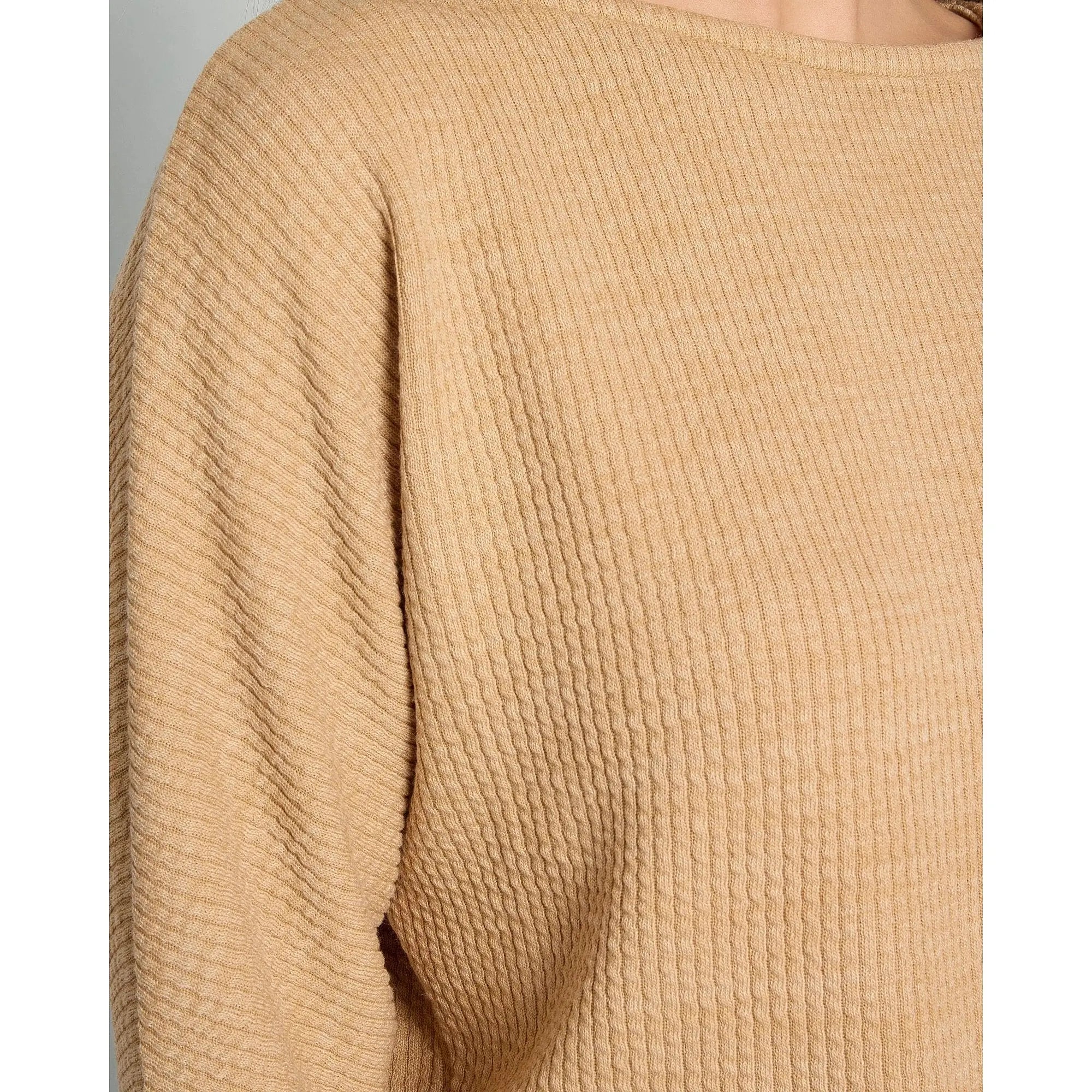 The Highland Top is a women's relaxed-fit ribbed knit top crafted from a soft, stretchy fabric for all-day comfort. Perfect for everyday wear or layering, it features a wide boat neckline and flattering dolman sleeves that create a chic, sculptural silhouette. This versatile piece is ideal for casual outings or dressing up your favorite jeans.